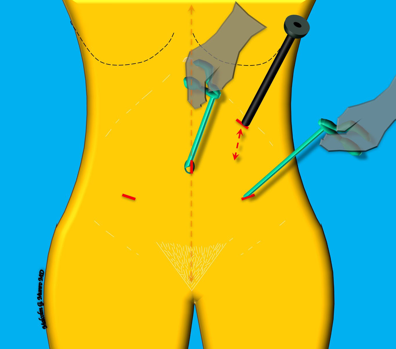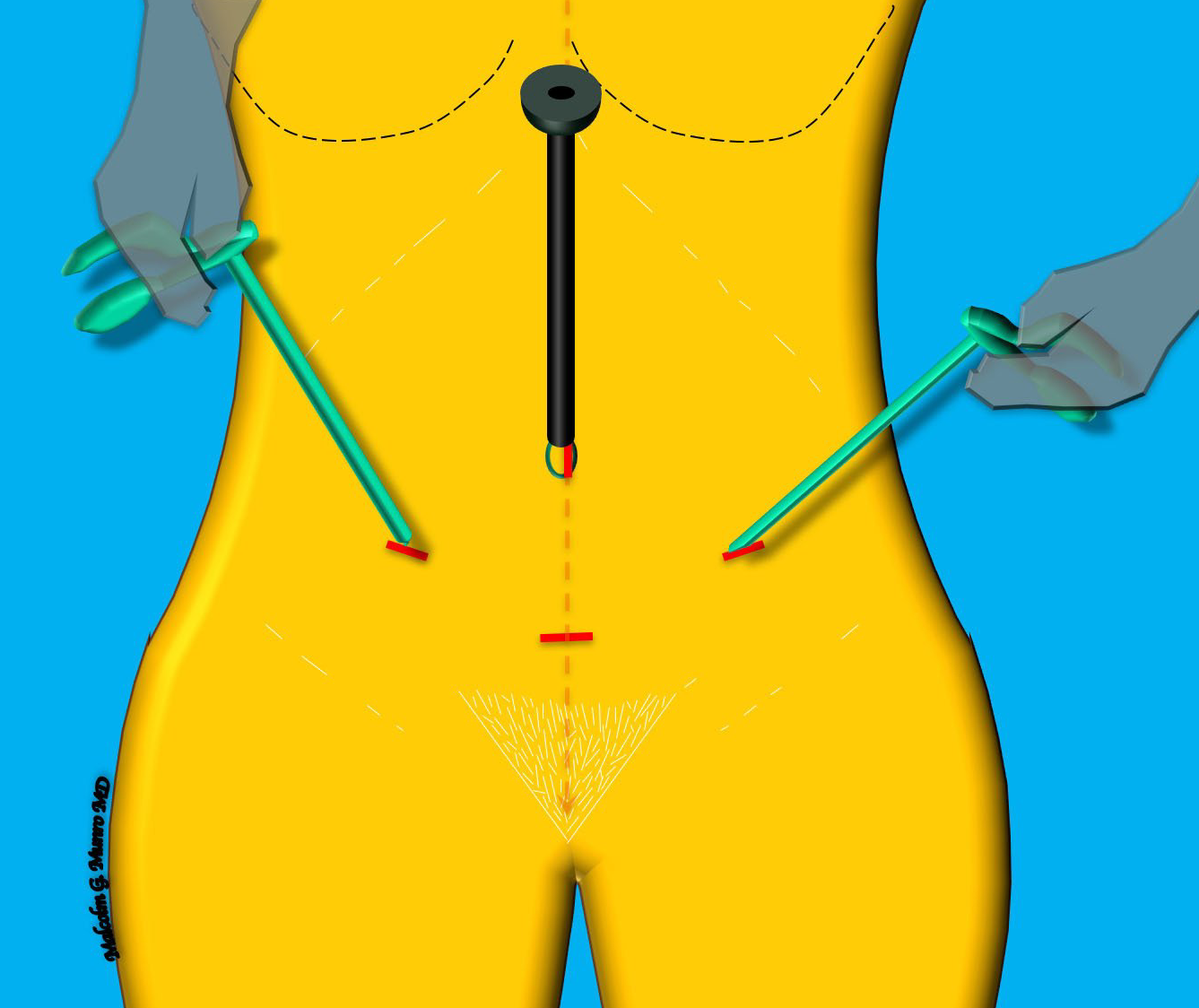 The classical positioning of ancillary ports for gynecological laparoscopic surgery comprised an ipsilateral and a suprapubic port with a contralateral port usually used by the assistant. However, such an orientation is ergonomically limiting as the surgeon often experiences fatigue of the shoulder muscles reaching for and manipulating instruments located in the midline, and especially the contralateral port. As a result, some place the midline suprapubic port between the umbilicus and pubic bone, a circumstance that, in Trendelenberg’s position, orients this port closer to the surgeon thereby reducing strain on the upper body.